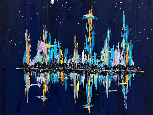 Night in the City Acrylic Cityscape Painting by Deb Bossert Artworks, 10" x 10"