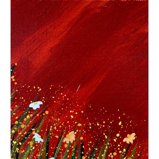 Sultry Red Wildflowers Reaching Toward the Sky 5 x 7 Acrylic Painting, Artist Signed