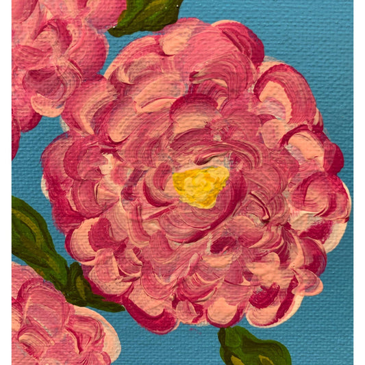 Magenta Flowers Painting, Wide Pedals, Yellow Pistil, Broad Green Leaf's, Beautiful Blue Background, Acrylic Artwork, Artist Signed, 5 x 7