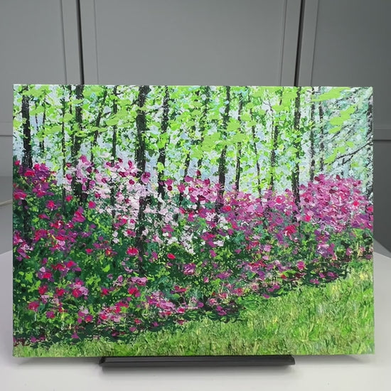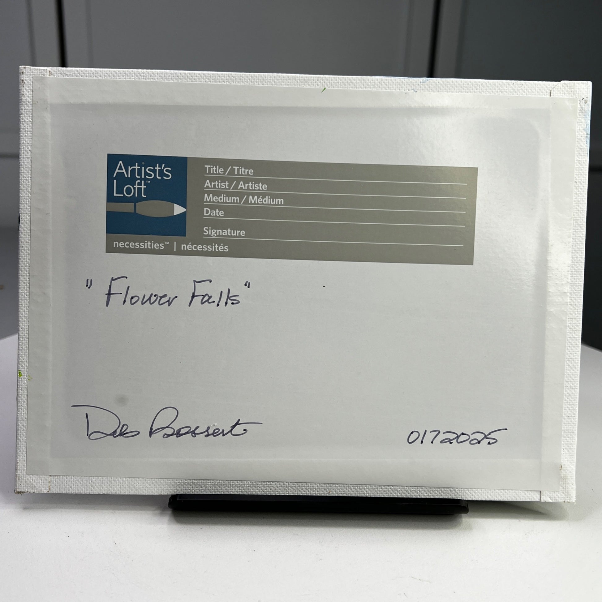 This delicate acrylic painting titled "Flower Falls" captures the timeless essence of nature's beauty. Vibrant blooms cascade within a serene woodland scene, evoking a sense of pastoral tranquility.
