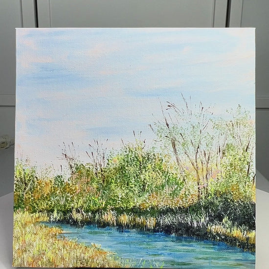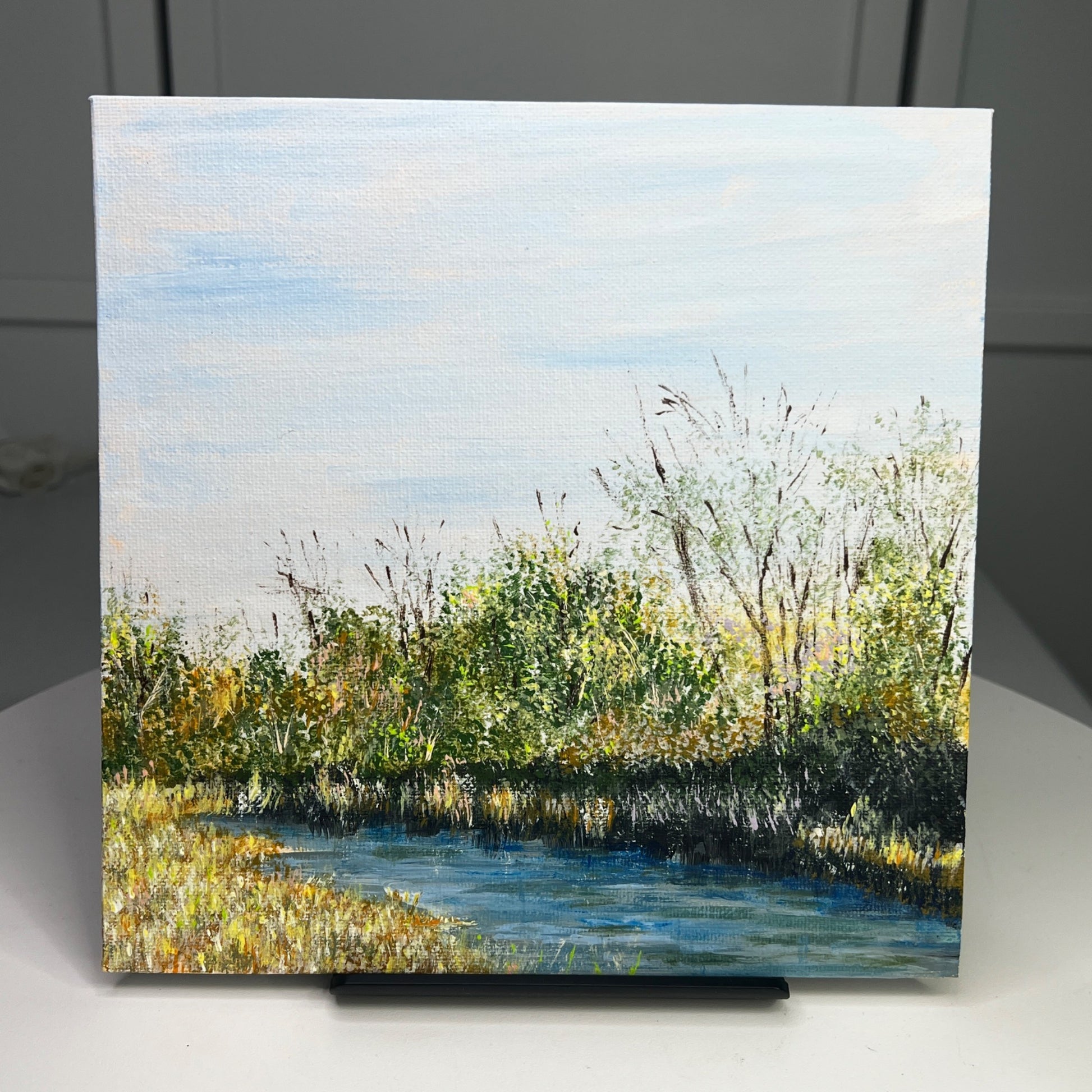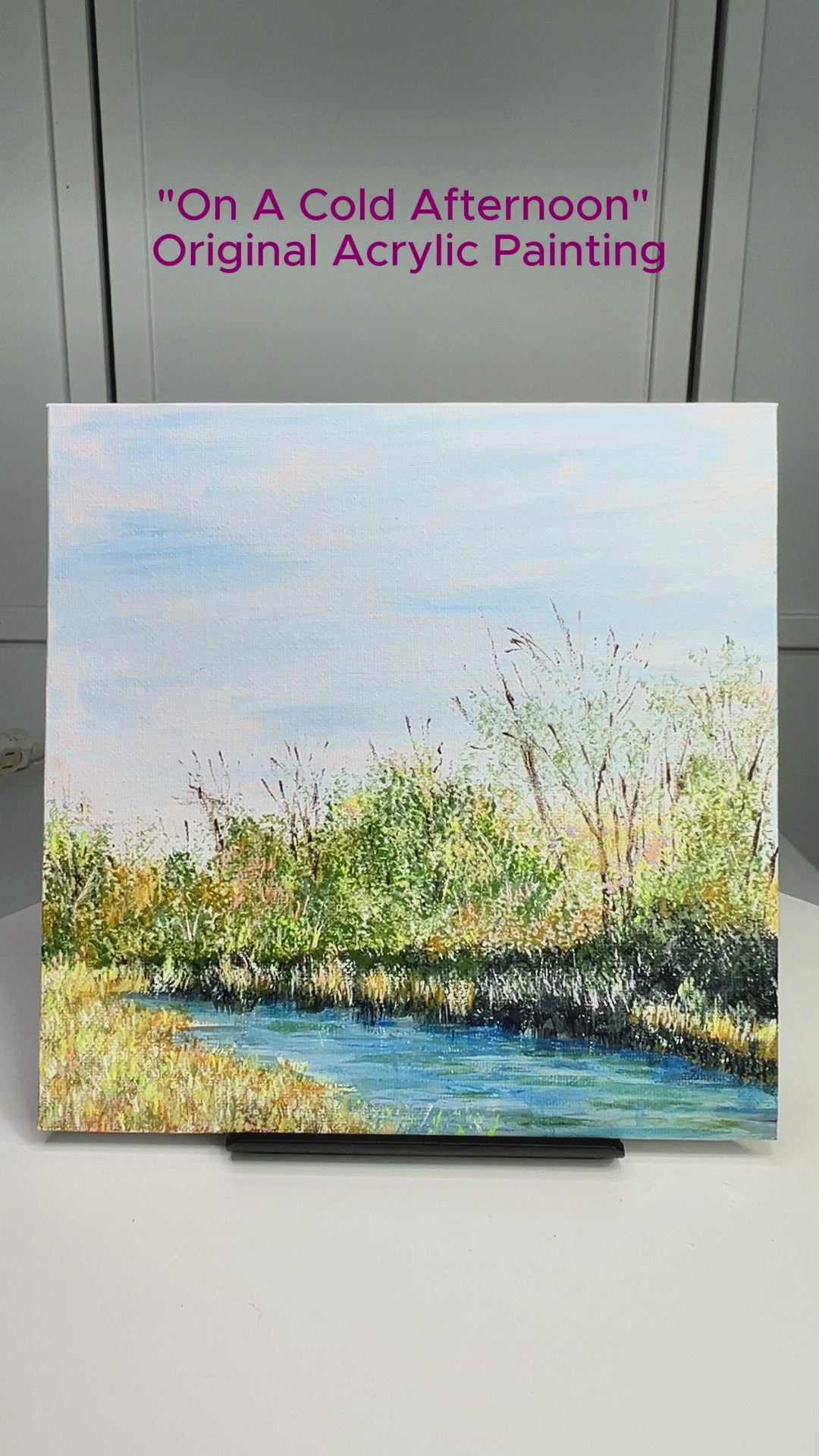This original acrylic painting offers a serene depiction of a natural landscape, capturing the subtle hues and textures of a cold afternoon. Its size and unframed format allow for versatile display options in various spaces. The intricate detail in the trees, lake, and grasses invites viewers to explore this tranquil scene.