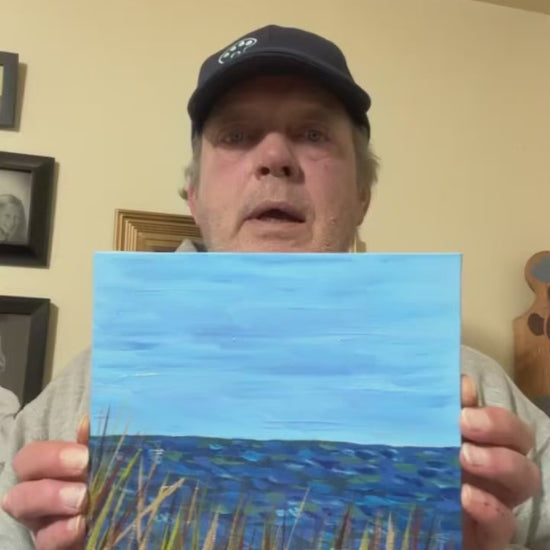 This pretty painting is 8" x 8" and is titled "Seagrass by the Sea." It depicts a peaceful seascape scene with a clear blue sky in the background with the ocean and sun kissed seagrass in the foreground. There are many bright colors in the painting -green, blue, gold, brown.