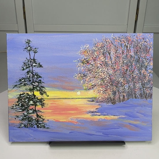Own a captivating piece of art showcasing a serene winter twilight landscape. This original acrylic painting offers vibrant colors and a tranquil scene for your space.