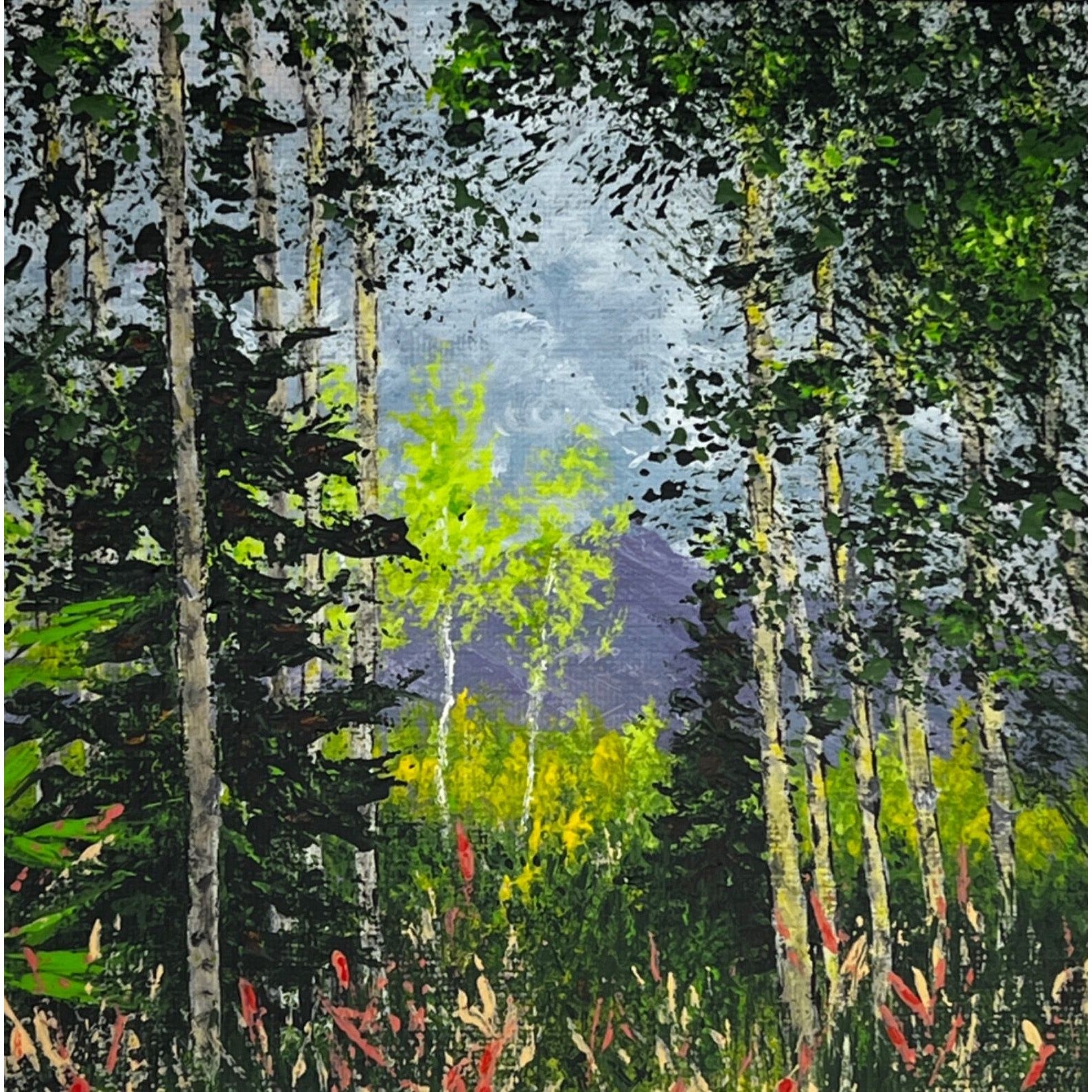 This original acrylic painting brings the serenity of nature into your space. A vibrant forest scene with rich, textured details captivates the eye showing you a view through the trees.