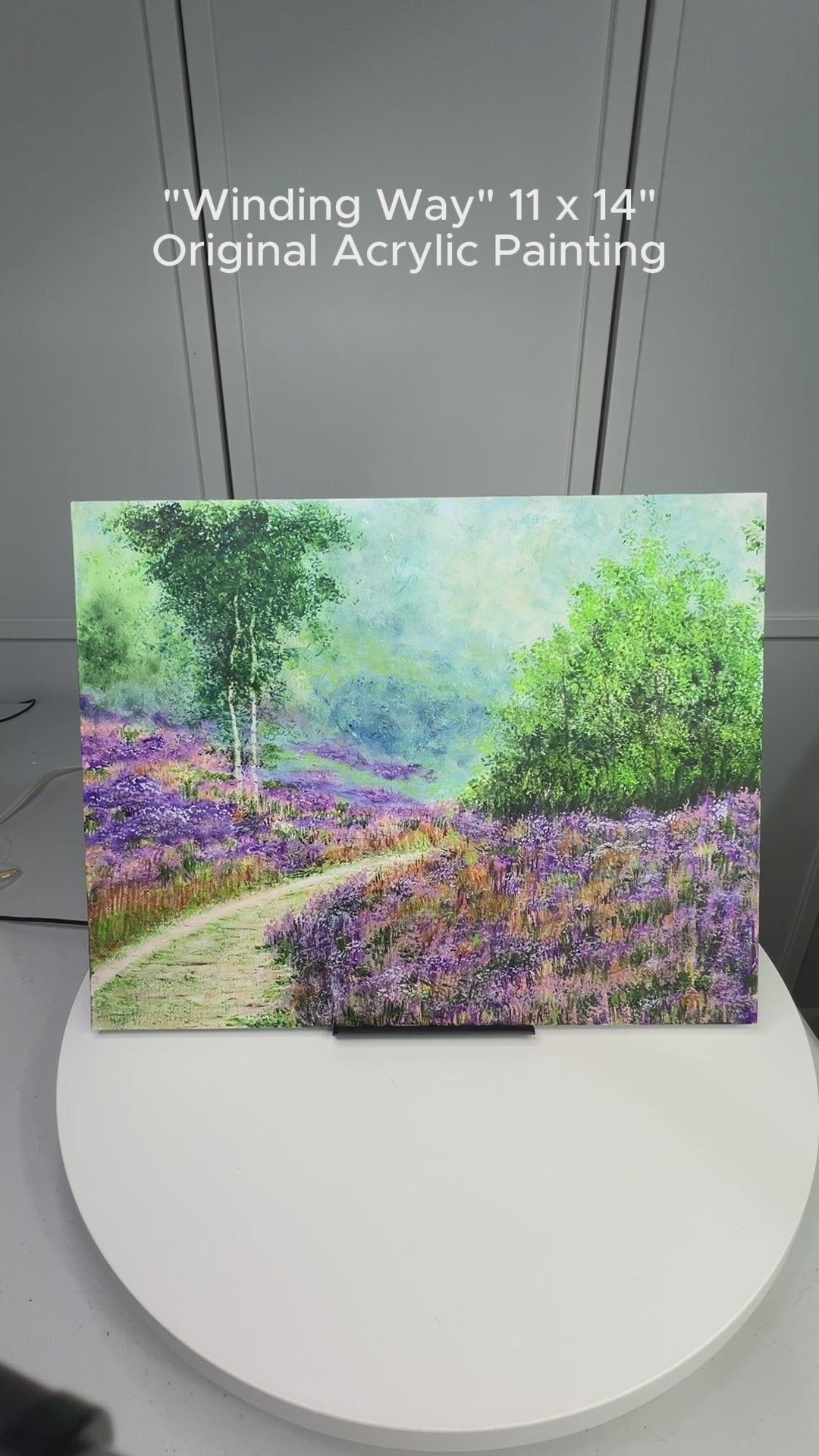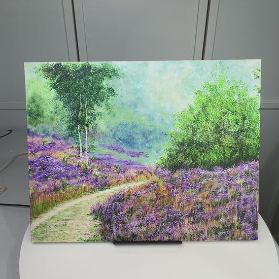 An original acrylic artwork depicting a serene pathway surrounded by vibrant lavender fields of wildflowers and lush greenery. Perfect addition to home or office decor.